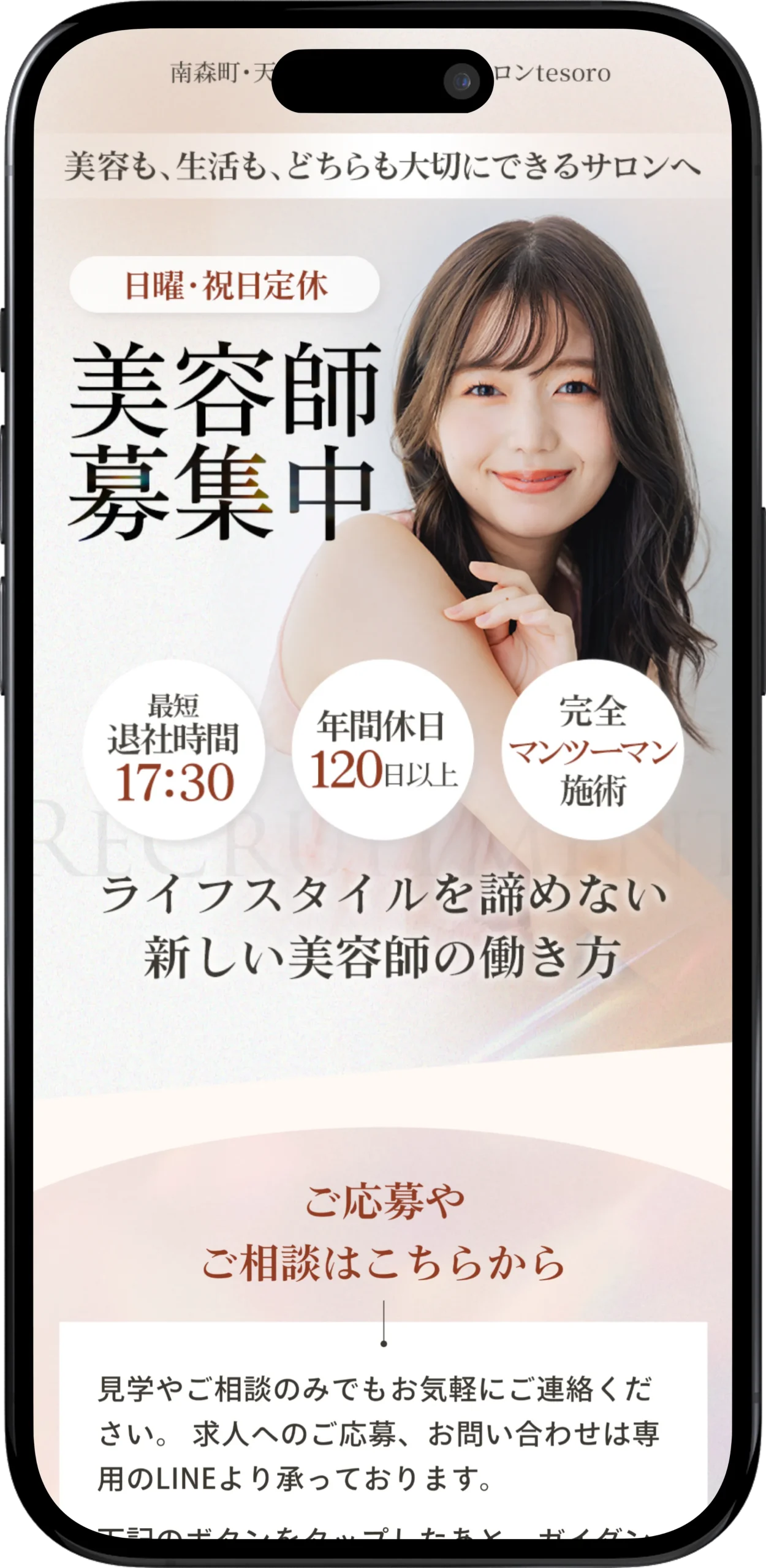 大阪の南森町・天満にある美容室「tesoro」様の美容師採用(求人)用LPを制作させていただきました。